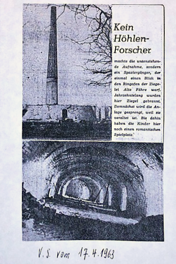 In der Volksstimme vom 09. März 1963 wird mit einem Foto und einem kurzen Text unter der Überschrift Sie hat ausgedient4 berichtet, dass die seit Langem stillgelegte Ziegelei Alte Fähre nun abgerissen werde und Ziegel, Balken und Latten vom Baukombinat Schönebeck für Bauarbeiten verwendet werden.